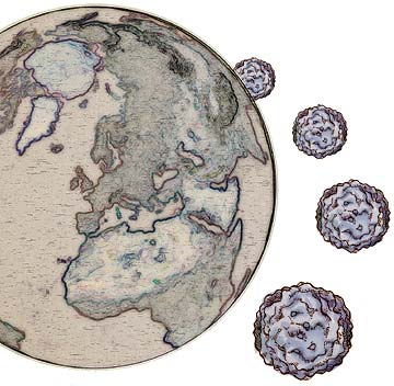 ![]() • Des études sérologiques rétrospectives ont démontré que le PCV2 était déjà présent chez le porc domestique en 1969. Pour l’Espagne, une très haute prévalence du PCV2 apparaissait à partir de 1985. • Des études anatomopathologiques rétrospectives ont aussi démontré que des cas isolés de MAP s’étaient déjà produits, au moins depuis les années 80. En Espagne, de tels cas sont survenus en 1986. • Depuis le milieu des années 90, la MAP a été progressivement identifiée partout dans le monde. Souvent, sa diffusion au sein de la filière porcine d’un pays prenait l’allure d’une épizootie. Dans tous ces cas, la forme clinique initiale et les caractéristiques génétiques du PCV2 étaient pratiquement identiques. Cette ample diffusion et l’impact qu’elle avait sur les performances des élevages, ont fait reconnaître la forte importance économique de la MAP. En Europe, son impact a été évalué entre 562 et 900 millions d’euros par an pour les producteurs. |