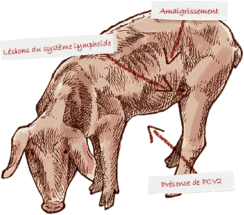 | - entraîne cliniquement amaigrissement et mortalité, - présente des lésions histologiques du système lymphoïde qui lui sont spécifiques, - associe ces lésions à la présence du PCV2. . |