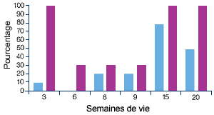 | (2) Profil sérologique (en violet) et profil PCR (en bleu) vis-à-vis du PCV2. Les manifestations cliniques ont commencé entre 7 et 10 semaines d’âge, ce qui correspond à une légère augmentation du nombre d’animaux infectés et à une séroconversion. |