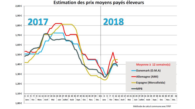 En Belgique, le cours du kilo vif a été reconduit dans le sillage du voisin allemand mais les poids sont repartis à la hausse pour se situer au‐dessus des poids de l’an dernier. En Autriche, le marché est équilibré et le cours stable, mais les secteurs de la viande et de la transformation se plaignent d’un commerce atone avant les fêtes de Pâques. Le prix d’acompte danois pour la semaine prochaine est revu à la baisse de 5 cents centimes, traduisant les difficultés des exportateurs européens sur les marchés exports. Dans le sud de l’Europe, les cours sont restés stables en Italie et le resteront jusqu’à Pâques. Les poids ont haussé fortement mais l’équilibre offre / demande se maintient.