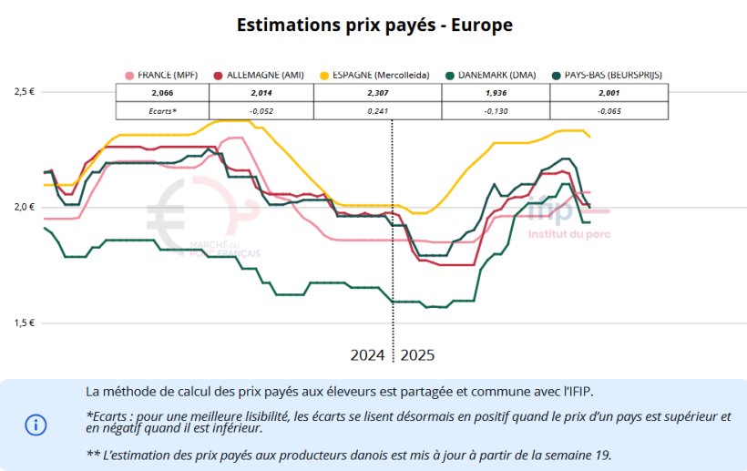 En Espagne, les abattoirs expriment leur incompréhension face au maintien du prix du porc ces dernières semaines, malgré une viande bon marché et une baisse des cours en Europe du Nord. Ils menacent de quitter les négociations et certains réduisent leur activité. De leur côté, les producteurs rappellent que l’offre est très limitée, avec un recul de 2,5 kg en trois semaines, soit 2 kg de moins qu’en 2024. En définitive, la cotation espagnole recule.