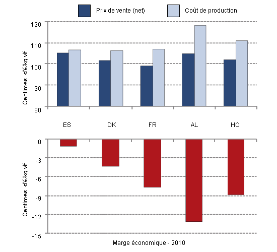 Selon des données fournies par SIP Consultors, la marge de la production porcine pour tous les pays européens membres d'Interpig a été négative en 2010, ce qui se produit depuis 2007 où a commencé la volatilité des matières premières.L'Espagne est le pays où la marge est la moins négative à cause d'un coût de production très serré (1,07 €) et un des prix de vente les plus élevés (1,05 €).