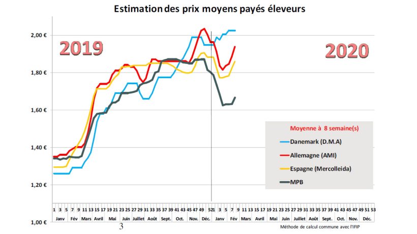 En Allemagne, où le mouvement de hausse a été initié en milieu de semaine, c’est la faiblesse de l’offre qui est à l’origine de cette surenchère. En effet, la publication officielle des abattages pour l’année 2019 fait part d’une nouvelle baisse de l’activité pour la troisième année consécutive avec un déficit de 1,7 million d’animaux par rapport à 2018 (-3%). Depuis l’année 2016 où 59,5 millions de porcs avaient été abattus, la baisse de l’activité s’élève à 4,3 millions de porcs. Cette baisse de l’offre s’exprime aussi par la forte chute des poids au cours de la semaine 7 avec près de 1 kilo de moins. Cette avide recherche des porcs s’explique aussi par une anticipation du retour à l’achat chinois sur de hauts volumes car le déficit de porcs vivants est énorme et nécessitera de toute façon des importations chinoises élevées. En attentant, les entreprises européennes ont recours à la congélation.