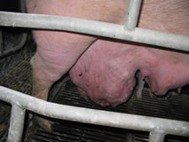 | Mammite aiguë | Mauvais drainage. Utilisation continue d'antibiotiques. Abreuvoirs abîmés. Dents des porcelets. Peu d'hygiène environnementale. Sol médiocre. Présence d'agents pathogènes. Litière de sciure ou copeaux. Traumatismes sur les mamelons. Sol humide. | Vérifier les causes. Vérifier les dommages sur les mamelons. Vérifier les contaminations des mamelles. Hygiène en maternité et qualité du sol. Recueillir les données individuelles Lavage du sol avec application de chaux (+ désinfectant). Vérifier toutes les procédures de conduite d’élevage. Eau |