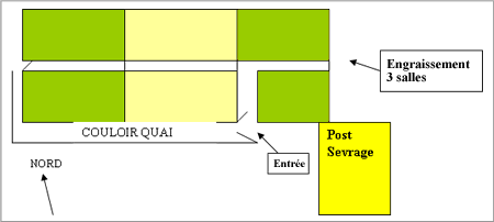 EngraissementEn engraissement, on entend en effet de la toux d’allure chronique sur les porcs les plus âgés (lot de 260 sujets) qui sont dans les salles figurant en vert sur le plan de masse. On observe certains animaux qui ont visiblement soufferts et sont inférieurs au reste du lot.