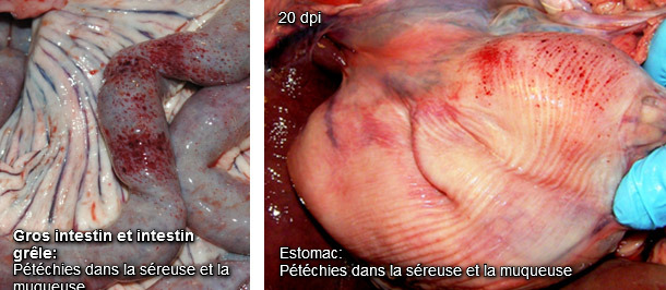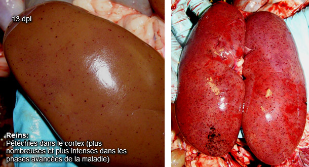 Les souches de PPAV diffèrent dans la virulence et peuvent générer une grande diversité de présentations, depuis des formes hyper aiguës jusqu’à des formes chroniques. Il y a aussi une grande variété de signes cliniques, la majorité sont typiques d'une fièvre hémorragique qui touche plusieurs organes. Certains génotypes comme le génotype II qui circule actuellement en Europe de l'Est, provoque une mortalité élevée, jusqu'à 100% chez les porcs domestiques et les sangliers. Les signes cliniques apparaissent après la période d'incubation qui varie de 5 et 15 jours. Normalement, le premier signe clinique est une fièvre élevée (> 40°C) accompagnée par une dépression et une perte d'appétit. D'autres signes cliniques incluent une rougeur de la peau des oreilles, de l'abdomen et des pattes, une difficulté respiratoire, des vomissements, une hémorragie nasale ou rectale, de la diarrhée et la mort en 2 à 10 jours. On décrit aussi souvent des avortements. Les découvertes lors des autopsies se caractérisent par des hémorragies dans les organes internes, particulièrement dans les ganglions lymphoïdes, la rate et les reins. Les formes moins virulentes du virus produisent des symptômes moins intenses. Chez les porcs qui survivent à l'infection, la virémie peut persister pendant plusieurs semaines (jusqu'à 6 mois) et les animaux récupérés présentent un certain risque puisque le virus a pu être isolé à partir des tissus. Il est important d'y mettre l'accent sur le fait qu’à partir de l'examen clinique, on peut seulement suspecter la PPA puisque d'autres maladies graves peuvent produire des signes cliniques identiques, la plus importante est la peste porcine classique (PPC), mais aussi le rouget, la salmonellose, la pasteurellose septicémique et d'autres septicémies bactériennes, des empoisonnements, etc. … Par conséquent, un diagnostic final peut seulement être obtenu avec une analyse de laboratoire, par la détection du virus et/ou des anticorps.