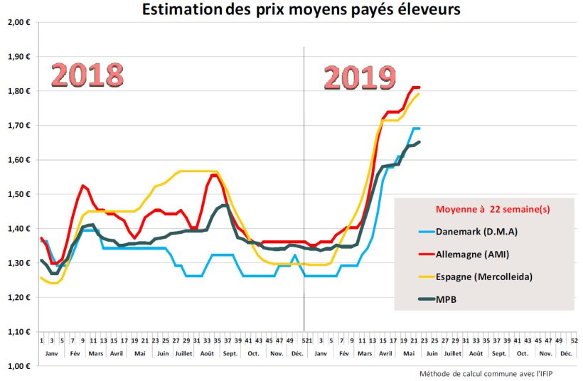 Au Marché du Porc Breton, la hausse du cours est de 1 cent entre les deux séances hebdomadaires, pour un prix moyen qui s’établit ainsi à 1,482 euro. Fait devenu assez rare pour être relevé, aucun porc n’a été affecté durant la séance du mercredi (lots sans enchère), traduisant des besoins certains pour les abattoirs. Cependant, malgré la mise en invendu de près de 1 000 porcs par les groupements vendeurs en début de séance, la hausse du cours est restée très limitée (+ 0,9 cent). Pourtant, les offres sont faibles au regard de la forte baisse des poids sur la première partie de la semaine (- 600g) qui fait suite à la baisse de 4 400 g de la semaine précédente et la demande, malgré le férié, est bonne. La fin de semaine, prolongée par le férié de l’Ascension, a connu une amélioration des conditions météo, favorable à la consommation des produits de grillade associée à un début de mois. Le bilan de l’activité d’abattage pour cette semaine de l’Ascension s’élève à 320 959 porcs abattus, pour des poids à 95,11 kg, en baisse de 365 g. Le prix moyen au MPB sur le mois de mai s’établit à 1,457 euro, en hausse de 22,85% par rapport au mois de mai 2018. En cumul depuis le début de l’année, le cours moyen est à 1,297 euro contre 1,178 euro en 5 mois 2018, soit une hausse de 10,1%.