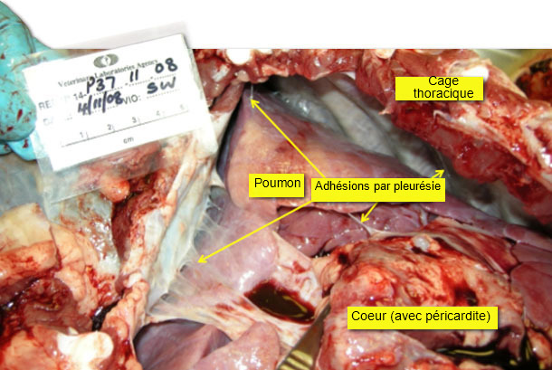 Figure 1. Lésions typiques de pleurésie chronique. On remarque des adhérences entre les poumons et la paroi thoracique, ainsi que la présence de pneumonie.