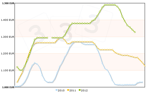 En 2009, la baisse cumulée à l'automne a été de 35 centimes, en 2010 elle a été de 23 centimes (1,25 à 1,014) alors que l'année dernière elle fut de 17 centimess (1,27 à 1,10). Cette année, on en a déjà compté 16 (1,49 à 1,33) sans voir la fin pour le moment même si on sent qu'elle ne peut pas s'éloigner.
