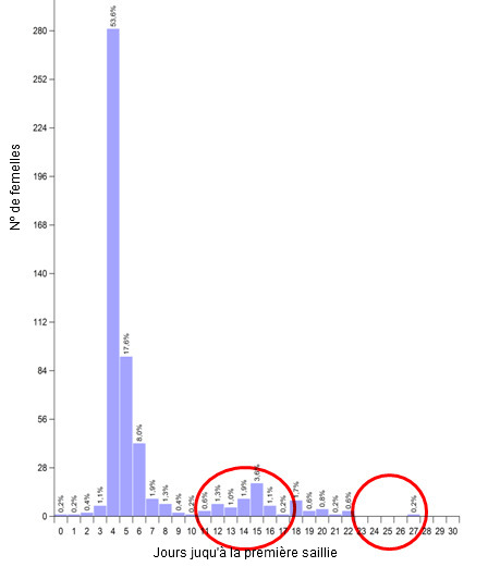 Une analyse des jours auxquels les truies sont saillies après sevrage (Fig. 2) montre que pratiquement aucune truie ne vient en chaleurs autour des 25 jours, alors que devraient le faire ces truies pour lesquelles on n'a pas identifié de chaleurs normales après sevrage.