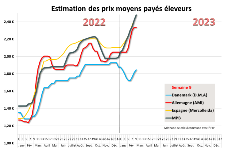En Espagne, le prix du kilo vif est revalorisé de 4,2 centimes. La poursuite de la hausse du cours du porc amène les producteurs à retarder les sorties d’élevage pour bénéficier des hausses avec des porcs plus lourds. Cela s’est traduit par une légère hausse des poids qui évoluent toujours à des niveaux record. En revanche, les abattages sont en perte de vitesse puisqu’ils enregistrent un repli de 5 % en janvier et de 10% en février. Selon Mercolleida, cette tendance devrait se poursuivre au moins jusqu’à la fin du printemps. A noter aussi, le manque flagrant de porcelet qui a propulsé les prix au sommet en Espagne mais aussi dans d’autres pays européens où le commerce de porcelets fait l’objet d’énormes spéculations. Sur le marché de la viande, les tarifs des pièces se sont stabilisés et il semblerait que les détaillants soient à présents plus réticents à toute nouvelle revalorisation. Les ventes au grand export se font au ralenti dans un contexte de forte concurrence avec les viandes du continent américain.