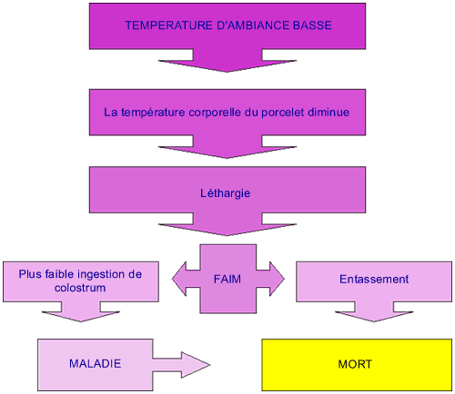 Le froid ressenti par le porcelet est à l'origine de l'entassement et de la mortalité après la mise-bas. Ce serait une grave erreur d'essayer de résoudre ce problème en augmentant la température de la maternité : plus la température est élevée plus les truies auront tendance à moins manger. Pour chaque degré supérieur à 23°C la truie mange 150 à 300 gr d'aliment en moins! Pour le bien-être de la truie en maternité, une température suffisante se situe autour de 20-21°C, bien que le porcelet ait des besoins supérieurs.