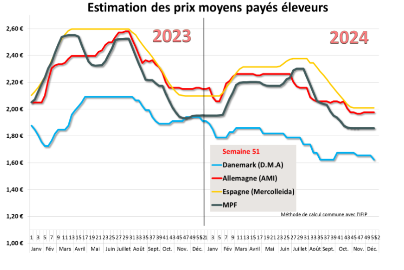 La situation reste stable et équilibrée, avec une demande toujours soutenue qui absorbe plus que l’offre espagnole. Cette dynamique a contribué à une baisse des poids la semaine dernière, lesquels reviennent désormais au niveau de 2023. Une activité minimale est prévue pour les trois prochaines semaines, avec cinq jours d’abattage en moins, mais les retards devraient être rapidement absorbés. Le marché de la viande est stable, bien qu’une légère baisse soit notée pour le jambon. En revanche, le marché du porcelet connaît une flambée des prix, notamment en provenance des Pays-Bas, rendant les prévisions difficiles. Le prix devrait être reconduit jusqu’à la deuxième semaine de janvier.