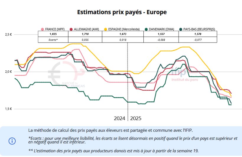 En Italie, la situation reste inchangée après cinq semaines consécutives de baisse. Aucun accord n’a été trouvé la semaine précédente : la proposition des abattoirs d’une baisse de 4 centimes a été refusée par les producteurs. La crainte désormais est de devoir vendre encore plus bas. Les prix de cette semaine sont fixés pour deux semaines, avec une réduction significative.