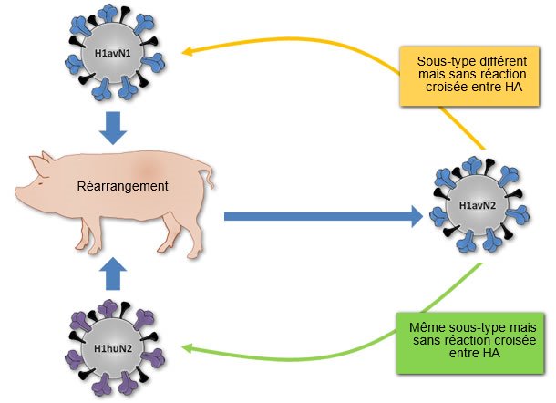 Bien que les trois H1 différents (H1avN1, H1huN2 et H1N1pdm) aient partagé dans le passé un ancêtre commun, il n'y a pas de croisement entre eux au niveau antigénique, ou alors il est très limité. Ceci est probablement dû au fait que les trois H1 ont évolué par dérive antigénique de manière isolée dans trois espèces différentes avant leur introduction dans le porc en Europe : dans des oiseaux l'H1avN1, dans des humains l'H1huN2, et dans des porcs en Amérique du Nord l'H1N1pdm. Par ailleurs, le réarrangement génétique peut générer de nouvelles souches de virus de l'influenza qui, même si elles appartiennent à un même sous-type, peuvent faire l'objet d'un croisement antigénique avec des virus appartenant à d'autres sous-types. La souche H1avN2 décrite au Danemark et en France en est un bon exemple. Cette souche contient une HA en rapport avec celle présente dans les souches H1avN1 et, par conséquent, il n'y a pas de croisement antigénique avec la souche H1huN2, mais si avec les souches H1avN1.