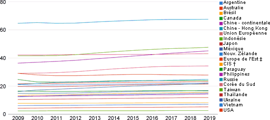 | Japon | 19,7 | 19,6 | 19,6 | 19,8 | 20,2 | 20,6 | 20,9 | 21,1 | 21,3 | 21,4 | 21,5 |