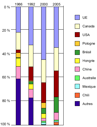 Concernant les exportations, l'Union Européenne est actuellement le premier exportateur mondial avec 34 % du total en 2005, même si le niveau a baissé par rapport à 2000. Par ailleurs, les Etats-Unis ont renforcé leur position en se placant comme le second grand exportateur devant le Canada; le Brésil et la Chine apparaissent maintenant comme de nouvelles puissances exportatrices.