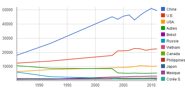 | Chine | 17.960 | 26.353 | 45.186 | 43.410 | 45.553 | 46.505 | 42.878 | 46.205 | 48.905 | 51.070 | 49.500 | 49,0 |