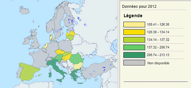 | Grèce | 195,63 | 167,41 | 157,48 | 156,56 | 173,67 | 194,75 | 216,13 | 216,11 | 204,85 | 206,09 | 210,26 | 207,90 |