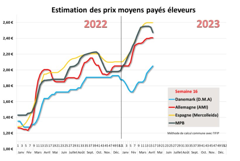 En Chine, le cours du porc est également baissier et se situe autour de 14CNY (1,86 euro). Selon Reuters, la production du premier trimestre a enregistré une hausse de 1,9 % pour atteindre 15,9 M de tonnes soit près de 199 millions d’animaux abattus (+1,7%). Le cheptel porcin est annoncé en hausse de 2% par rapport à il y a un an pour 430,94 M de têtes (mais en baisse par rapport au trimestre précédent), le cheptel truies s’élèverait à 43,05 millions de têtes, en baisse de 0,9% par rapport au mois précédent. La hausse de la production s’expliquerait par l’attente des éleveurs d’une reprise de la demande à la fin de l’année 2022 avec des prix élevés. Mais, les restrictions dues au Covid 19 ont réduit la demande et précipité les mises en marché autour du Nouvel an fin janvier, faisant pression sur le prix du porc. Les pertes financières par porc sont importantes et la résurgence de la fièvre porcine africaine dans le nord du pays où se concentre une grosse partie de la production chinoise n’arrange en rien la situation de la filière. Selon Rabobank, le prix du porc pourrait ne pas remonter avant la fin du deuxième ou du troisième trimestre 2023, ce qui signifie aussi peu d’amélioration des importations chinoises dans cet intervalle.