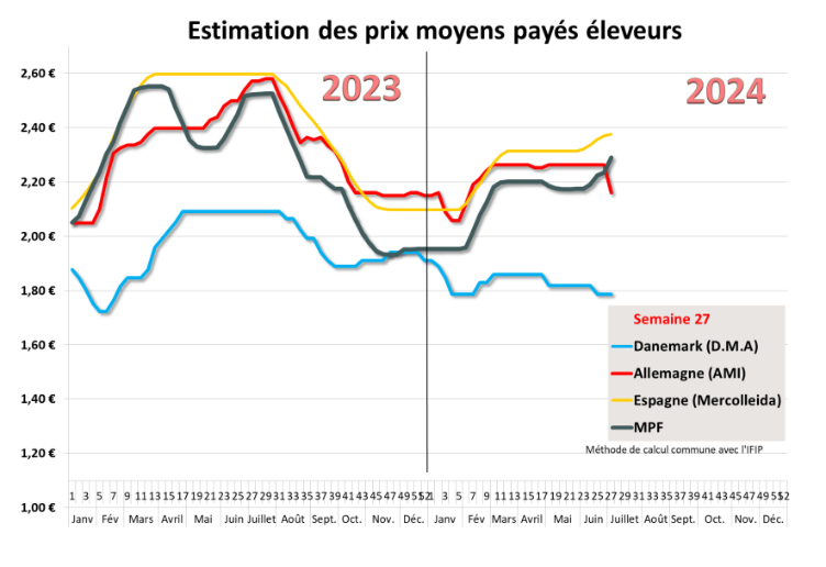 En Allemagne, la référence officielle a été abaissée de 10 centimes sous la pression des abattoirs qui déplorent un commerce insuffisant et des marges déficitaires. L’organisation du championnat européen de football ne provoque pas les ventes espérées et le début des congés scolaires est traditionnellement synonyme de faible demande en raison de nombreux départs vers d’autres pays. Il pourrait également être ajouté, une météo peu propice à la consommation de produits de grillades, une inflation qui limite la consommation et la fièvre porcine africaine qui restreint les ventes pays tiers. La faiblesse saisonnière de l’offre ne peut compenser cette addition de facteurs défavorables. A noter aussi, la baisse du prix du porcelet qui, après 16 semaines de stabilité, a également connu une baisse de 5,5 euros. Ailleurs dans le nord de l’Europe, les tendances ont été variables malgré la forte baisse du prix allemand.