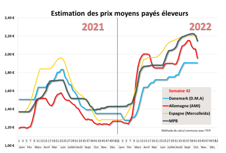 Dans la foulée de la baisse allemande, le prix en Autriche a également décroché de 10 centimes bien que les offres disponibles soient particulièrement basses. De même, en Belgique, le cours du porc au kilo vif se replie de 8 cents, de 7 cents aux Pays-Bas. Le prix d’acompte danois, placé assez bas en comparaison avec les autres prix européens, est resté stable.