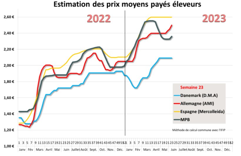 En Espagne, la situation reste inchangée à savoir une demande soutenue des abattoirs pour des offres également annoncées encore plus faibles cet été en raison des températures élevées qui vont impacter la croissance des porcs. Selon un média français, le printemps 2023 (du 1er mars au 31 mai) a été le plus chaud et le deuxième plus sec jamais enregistré (OF du 8 juin). Malgré la faiblesse de l’offre, le prix reste stable pour la dixième semaine consécutive : sa position de leader réduit la compétitivité de la viande espagnole et l’insuffisance des offres rend inenvisageable la baisse du prix du porc. D’autre part, le coût élevé du stockage frigorifique oblige la vente en frais alors que l’export est au ralenti et que la consommation intérieure reste faible en raison de l’inflation.