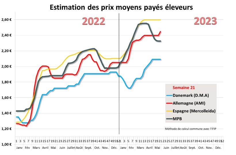 A Mercolleida, en Espagne où la hausse allemande était attendue depuis plusieurs semaines, le cours est resté stable. La situation de marché est inchangée avec des offres inférieures à la demande des abattoirs, tendance qui devrait s’accentuer avec la montée des températures estivales qui ralentiront la croissance des animaux. Cependant, pour le moment, le prix élevé de la viande espagnole complique les ventes, en particulier vers les grands marchés export comme les pays du sud-est asiatique où d’autres pays exportateurs (USA, Brésil, Canada) ont renforcé leurs parts de marché.