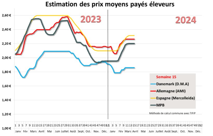 Aux Etats-Unis, le cours du porc continue de hausser. Les abattages de la semaine 15 ont atteint les 2 485 000 porcs, volume le plus élevé pour cette période, au moins pour ces 10 dernières années. Les marges des abattoirs se situent également parmi les meilleures de ces 10 dernières années pour cette période de l’année. Sur le marché de la viande, les hausses sont généralisées, mais ce sont les jambons qui sont à l’origine de la majeure partie de l’augmentation. La valeur de la poitrine continue d'augmenter d'environ 67 % par rapport à l'année dernière, tandis que la valeur du porc frais est également en hausse de plus de 10 %. La récente baisse des coûts de production laisse entrevoir des profits pour un élevage type naisseur-engraisseur en 2024, estimés à 10 $ par porc commercialisé. Cette embellie interviendrait après les pertes de 24 $ / porc de l’année 2023, la pire année depuis 2009 (-26$).