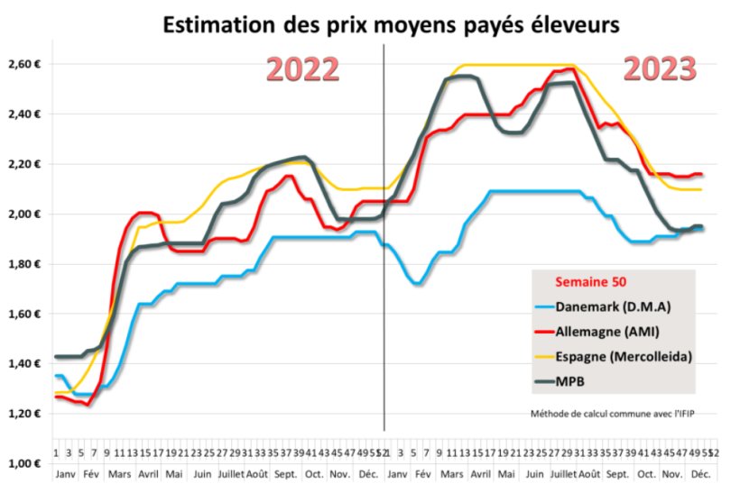 De même en Espagne où la référence de Mercolleida a été reconduite, la situation se présente sans grand changement et les offres sont suffisantes pour couvrir les besoins actuels. Une baisse des poids avait été enregistrée la première semaine de décembre, elle intervenait après plusieurs mois de hausse ininterrompue. Mais une nouvelle croissance des poids est intervenue la semaine dernière en raison des 2 fériés qui, malgré une activité d’abattage souvent maintenue, n’ont pas été sans effet sur la fluidité. Sur le marché de la viande, le commerce est dynamique en particulier vers les pays de l’Est comme jamais vu auparavant mais cela permet aussi de compenser la baisse des ventes à destination des pays tiers. Comme partout ailleurs, un ralentissement d’activité devrait intervenir cette semaine et se poursuivra jusqu’au début de l’année prochaine.