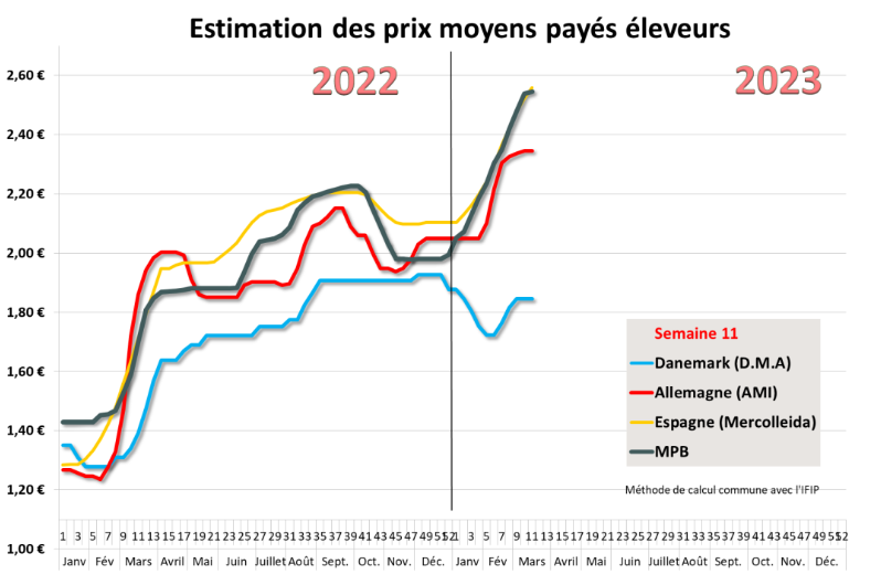 La hausse du prix du porc se poursuit au Marché du Porc Breton mais donne quelques signes d’essoufflement après une croissance ininterrompue et un total de 55,3 centimes enregistré depuis le début de l’année. Avec 0,8 cent de hausse la semaine passée, le cours s’élève à 2,374 euros. Les deux ventes ont été plus laborieuses pour les groupements vendeurs et malgré les 3 721 porcs invendus pour enchères insuffisantes, les abattoirs ont maintenu leur position ce qui s’est traduit par une amplitude de prix qui n’a pas dépassé les 0,9 cent jeudi. L’activité sur la zone Uniporc Ouest, perturbée mercredi par les mouvements sociaux, s’est élevée à 354 675 porcs abattus, supérieure de 7685 porcs par rapport à la semaine précédente, mais inférieure de 28 800 porcs (- 7,5%) en comparaison avec la même semaine 2022. Depuis le début de l’année, l’activité a baissé de 255 265 porcs (- 6,1%) soit une baisse moyenne de 23 200 porcs par semaine ! Les poids moyens de la semaine passée ont augmenté de 173 grammes à 95,95 kilos, ils tendent à se rapprocher de la même référence 2022 (96,01 kg). Depuis le début de l’année, les poids moyens sont inférieurs de 670 grammes aux poids moyens des 11 premières semaines 2022.