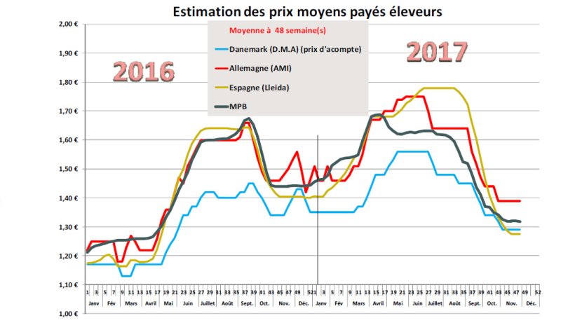 La dernière séance de vente du mois de novembre a clôturé à 1,178 euro, en recul de 0,1 cent. La moyenne du mois de novembre s’élève à 1,180 euro (‐ 9,2 % par rapport au mois de novembre 2016 dont le cours moyen atteignait 1,30 euro). L’amplitude de prix sur ce mois écoulé a peu varié : 0,8 cent, 1,178 euro étant le prix le plus bas de l’année 2017. Les abattages dans la zone Uniporc Ouest ont été d’un très bon niveau à nouveau cette dernière semaine à 377 230 porcs abattus, permettant ainsi aux poids d’amorcer une baisse de 178 g pour 95,71 kg. Depuis 3 mois, les abattages de porcs dépassent les niveaux de 2016 de 3,6 % pour des poids en hausse moyenne de 1,1 kg sur ces 3 mois. Depuis le début de l’année, la baisse de production s’atténue pour se fixer à ‐ 1,86 % sous l’effet d’une activité accrue dans cette dernière partie de l’année. Sur la période des 12 derniers mois, la baisse de production n’est plus que de ‐1,06 %.