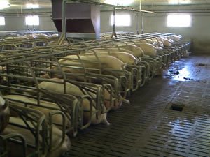 Conduite hygiénique de la salle (truies bloquées sur plusieurs rangs).
