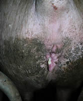 · Vulves sales (pas de lavage des truies au sevrage) mais pas d'écoulement visible.
