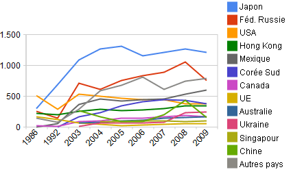 | Japón | 297 | 684 | 1.091 | 1.269 | 1.314 | 1.154 | 1.210 | 1.267 | 1.210 | 22,7 |