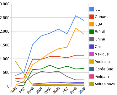| Brésil | 800 | 1.200 | 2.560 | 2.600 | 2.710 | 2.830 | 2.990 | 3.015 | 3.123 | 3,12 |