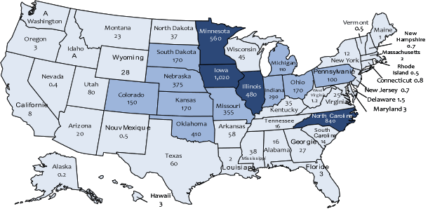 Les états de l'Iowa et de la Caroline du Nord totalisent 43,1 % du cheptel porcin américain. avec le Minesota et l'Illinois, ils atteignent 61 %.