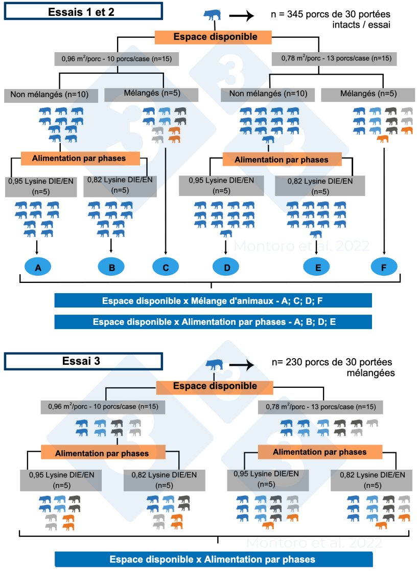 Résumé de l'article commentéCamp Montoro J, Pessoa J, Solà-Oriol D, Muns R, Gasa J, Manzanilla EG. Effect of Phase Feeding, Space Allowance and Mixing on Productive Performance of Grower-Finisher Pigs. Animals. 2022; 12(3):390. https://doi.org/10.3390/ani12030390 Méthodes : Cette étude examine les effets de l’espac disponible, du mélange d'animaux et de l'alimentation par phases sur les performances des porcs d'engraissement. Trois essais ont été réalisés. Dans les essais 1 et 2, 345 porcs/essai sont entrés dans la phase d'engraissement à l'âge de 11 semaines et ont été répartis dans les deux espaces disponibles : 0,96 m2/porc (n = 15 cases ; 10 porcs/case) et 0,78 m2/porc (n = 15 cases ; 13 porcs/case). Le mélange d'animaux a été appliqué à 5 cases par espace disponible, ce qui a donné lieu à un plan factoriel 2 × 2 (espace disponible × mélange). Pour l'alimentation progressive, 2 régimes contenant 0,95 et 0,82 g de lysine digestible standardisée iléale/MJ d'énergie nette ont été distribués dans 5 cases par espace disponible (dans des cases sans mélange d'animaux), ce qui a donné lieu à un autre plan factoriel 2 × 2 (espace disponible × alimentation progressive). Dans l'essai 3, 230 porcs sont passés à la phase d'engraissement à l'âge de 11 semaines, ont été mélangés et répartis dans 4 traitements ("espace disponible" × alimentation par phases ; n = 5 cases). Les données ont été analysées à l'aide de modèles linéaires mixtes généralisés. Figure 2 : Illustration schématique du plan expérimental des essais 1, 2 et 3. Dans les essais 1 et 2, le plan expérimental était un dispositif factoriel 2 × 2 avec, respectivement, le mélange d'animaux et l'alimentation par phases. Dans l'essai 3, le plan expérimental était un dispositif factoriel 2 × 2 avec comme traitement espace disponible x alimentation par phases et le mélange d'animaux a été appliqué à toutes les cases. Source : Montoro et al : Montoro et al. 2022. Résultats : l'espace disponible n'a pas affecté les performances. Les porcs non mélangés pesaient 5,40 (essai 1) et 5,25 (essai 2) kg de plus que les porcs mélangés à l'âge de 21 semaines. L'alimentation par phases a réduit les performances des porcs de 3,45 (essai 1) et 4,05 (essai 2) kg à l'âge de 21 semaines. Conclusion : le mélange des animaux et la réduction du rapport lysine digestible iléale standardisée/énergie nette de 0,95 à 0,82 g/MJ à l'âge de 15-16 semaines ont un effet plus marqué sur les performances que la réduction de l'espace disponible de 0,96 à 0,78 m2/porc. |