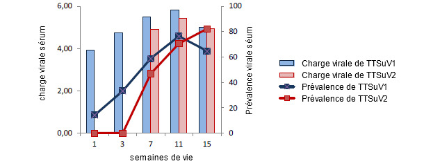 Figure 3. Charges virales (colonnes) et prévalences (lignes) sur des échantillons longitudinaux de porcs de 1 à 15 semaines de vie