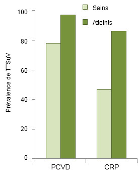 Figura 1. Prévalence de TTSuVs chez les porcs sains(vert clair) et chez les attents (vert foncé) de PCVD et CRP. |
