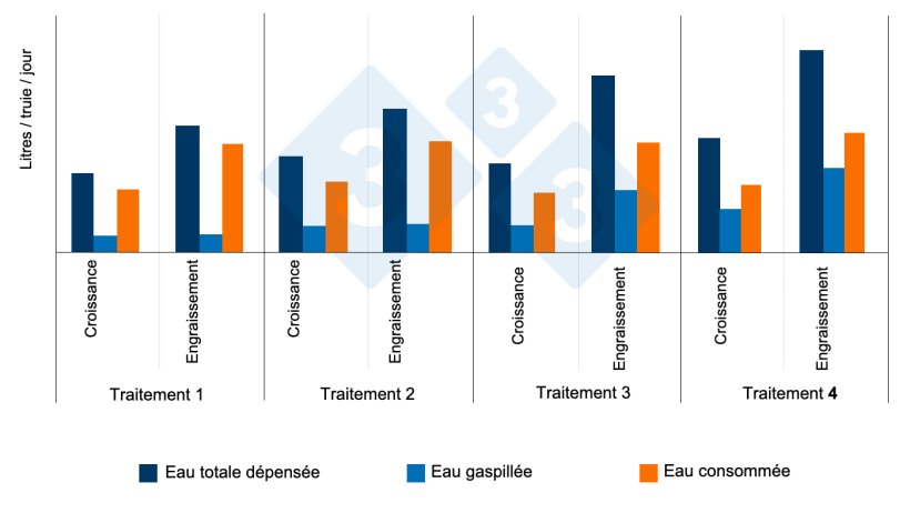 Figure 6 : Eau consommée, gaspillée et dépensée en comparant 3 types d'abreuvoirs pendant 14 jours chez des porcelets sevrés. Source : Torrey et al : Torrey et al. 2008.