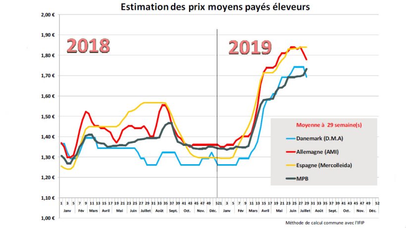 Comme précédemment, la référence allemande a entraîné dans sa chute les autres cotations des pays du Nord de l’Europe, leurs marchés intérieurs étant également assez calmes durant la période estivale. C’est le cas en Belgique dont la référence du kilo vif baisse de 2 cents malgré des offres limitées avec des poids qui régressent fortement. En Autriche, le cours recule de 3 cents en raison d’un marché intérieur au ralenti et de l’entrée de viandes étrangères aux tarifs plus avantageux. Les marchés hollandais et danois sont sur les mêmes tendances baissières.