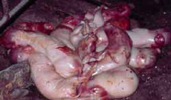 La mortalité avant sevrage avait augmenté légèrement et quelques portées avaient de la diarrhée et des articulations inflammatoires. Les porcelets répondaient bien aux traitements antibiotiques. Le 14 Juillet, il y eut 10 truies qui cessèrent de manger et, à ce moment. Les diarrhées et les problèmes d'arthrites ne répondirent plus aux traitements antibiotiques. |
