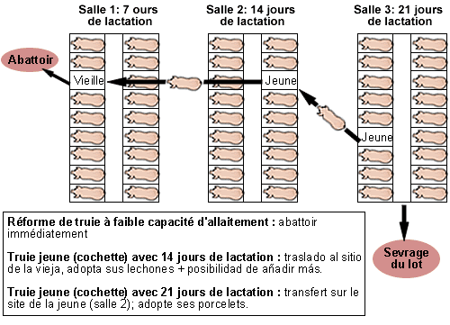 La truie réformée est immédiatement abattue et, à sa place, on met une jeune nourrice (même de première mise-bas) pouvant allaiter plus de porcelets.