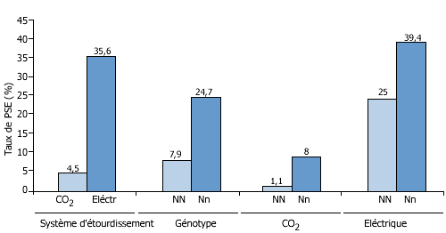 | Distribution (%) des carcasses PSE en fonction du système d'étourdissement et du génotype |
