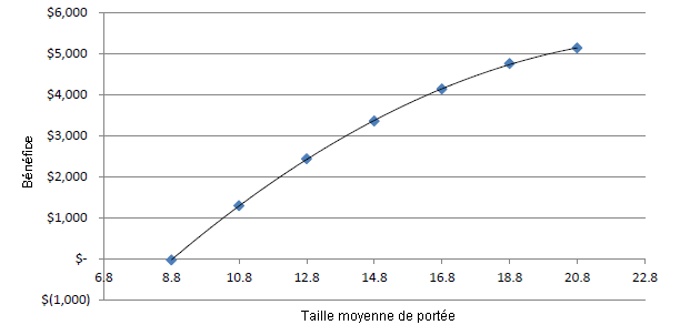 La figure 2 montre la marge pour chaque taille de la portée. L’augmentation de le taille de la portée a entraîné une augmentation du bénéfice bien qu’à une rythme descendant : à un moment donné, à partir de 20.8, on s’attend à ce que le bénéfice se maintienne ou commence à décliner. L'évaluation des coûts pour les portées supérieures est très difficile à cause de la complexité des impacts économiques et biologiques.