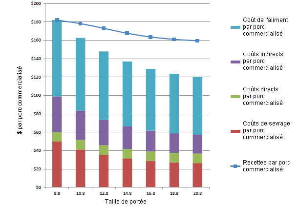 Les coûts calculés par porcelets individuels montrent que le coût total moyen par porc commercialisé diminue avec l'augmentation de la taille moyenne de la portée. La figure 1 montre les coûts par porc commercialisé selon la taille des portées. Les coûts totaux de l’alimentation ont augmenté avec l’augmentation du nombre de porcelets par portée, mais le coût de l'alimentation par porc commercialisée a diminué avec cette augmentation. Cette diminution est due au fait que dans les plus grandes portées les porcelets naissent plus petits qui restent à un poids plus faible dans le système de production, de sorte qu'ils consomment moins d'aliments que les animaux plus grands.