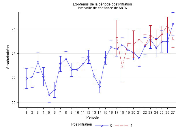 Graphique 2 : production de porcs sevrés/truie/an ajustée par période (3 mois) en comparant des élevages non filtrés (bleu) et des élevages filtrés (rouge)