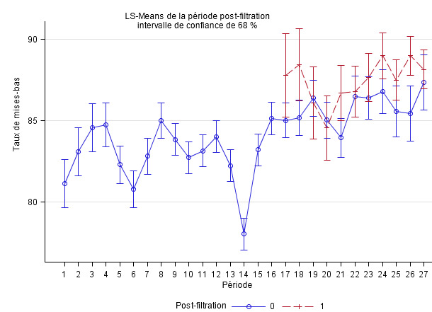 Graphique 1 : taux de mises-bas ajustée par période d'étude (3 mois) en comparant des élevages non filtrés (bleu) et des élevages filtrés (rouge)