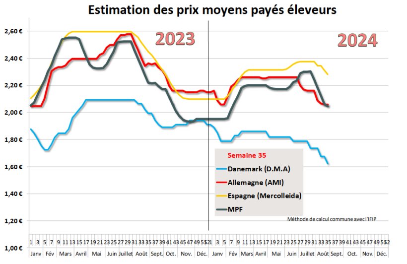 Aux Etats-Unis, le prix du porc poursuit sa baisse. L’activité d’abattage de la semaine passée est restée soutenue d’autant plus que cette nouvelle semaine comporte un férié (Labour Day, le 2 septembre). D’autre part, selon l’Université de l’Iowa, pour le quatrième mois consécutif, un élevage type naisseur- engraisseur produit des bénéfices après 7 mois de pertes. Les principales raisons sont la baisse des coûts de production et la hausse moyenne du prix du porc. La demande intérieure semble bonne au vue des stocks de juillet qui s’établissent 4% sous le niveau du mois de juillet 2023 car même si les exportations sont satisfaisantes, elles ne sont pas non plus exceptionnelles.